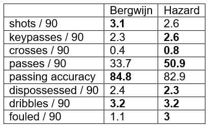 Comparison to Hazard: Just as Memphis, Bergwijn also makes more shots per 90 and surprisingly, he even got a better pass accuracy than the star player he is compared to. However, considering those stats come from Eredivisie, you have to look at them with awareness, as they could turn out to be worse in the Premier League. Whereas they both are producing similar numbers in their dribbles and dispossessed section, Hazard is again far more fouled than the young Dutch international. Eden is a touch of better at crossing and key passes but outclasses another player in the number of passes he plays per 90.