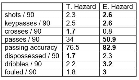 Where the Dutch national obviously lacks, are his dribbling numbers, as Eden dribbles nearly twice as much as Memphis is doing. He is also being fouled more, which may be due to the aggressive tackling in the EPL. Another impressive number is the amount of passes Hazard makes per 90, the bigger number, combined with better accuracy, also suggests that he gets the ball from deeper and is more involved in the teams build up play.