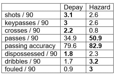 Comparison to Hazard: Depay puts up more shots and key passes per game than Hazard, he also makes more crosses and is dispossessed less per 90 than the (still) Chelsea player is. The crossing, especially, could bring a new aspect to game of Chelsea, as they usually play with a striker who is strong in the air.