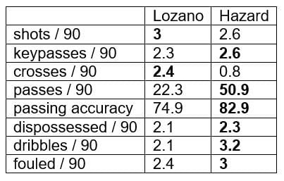 Comparison to Hazard: "Chucky" is another player who does not come close to the Chelsea player's passing stats. The numbers of Lozano even suggest that he is more of a striker that likes to move out wide, which his crossing numbers also would confirm. When it comes to the other brackets, he is only better in his shot number. In the other statistics, such as key passes, dispossessed, dribbles and fouled per 90, Eden is superior to him. One surprise is that he is the first player, who gets nearly fouled as much in comparison, which may be due to his massive speed with the ball on his feet.