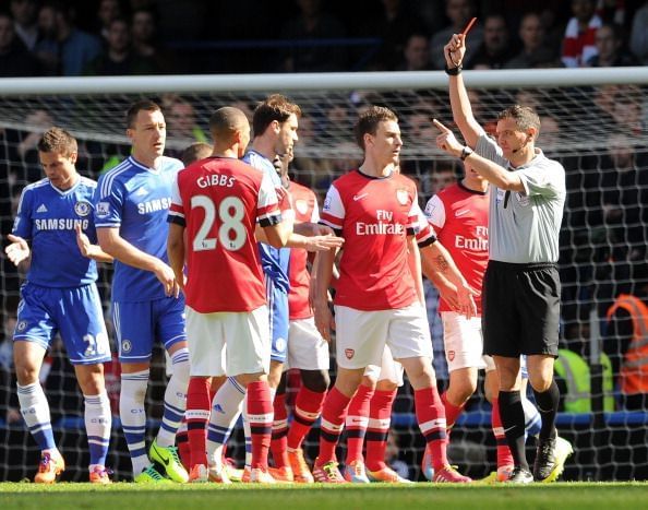 Bizarrely, Marriner sent off Kieran Gibbs instead of Chamberlain for the incident. Indeed the two Arsenal players shared the same complexion but the two other officials surely could've helped Marriner in this decision?