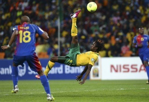 South Africa midfielder Lerato Chabangu (C) tries an overhead kick during a group A football match against Cape Verde at the 2013 African Cup of Nations in Soweto on January 19, 2013 at Soccer City. The match ended in a goalless draw.