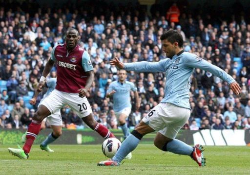 Manchester City striker Sergio Aguero shoots at West Ham’s goal during their English Premier League match in Manchester on April 27, 2013. Aguero and Yaya Toure scored a pair of fine goals as Manchester City began life as former Premier League champions by winning 2-1 at home.