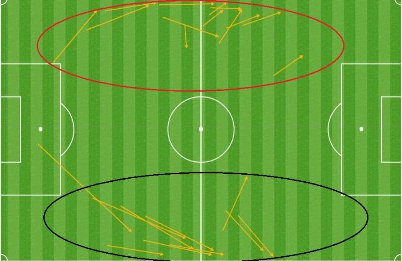 The numbers prove the same as the 2nd most used passing combination (13 passes) for Barcelona was Mathieu to Neymar (circled red) while Pique to Rafinha (circled black) stood as the 5th most used (10 passes). Unsurprisingly, the first, third and fourth most used pass combinations are between the centre-backs between themselves (1st Umtiti to Pique, 3rd Pique to Umtiti, 5th Umtiti to Mathieu).