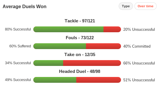 However, it is duels won that Bergara leads. He has won 35 duels to Illarra’s 33. The former has won 92% of his tackle so far this season.