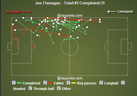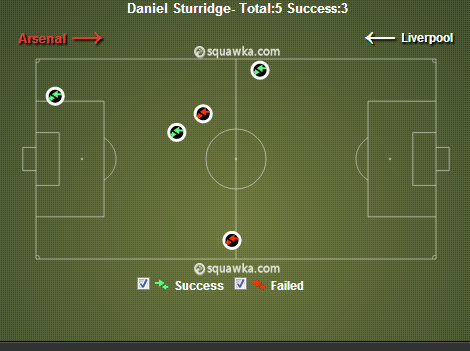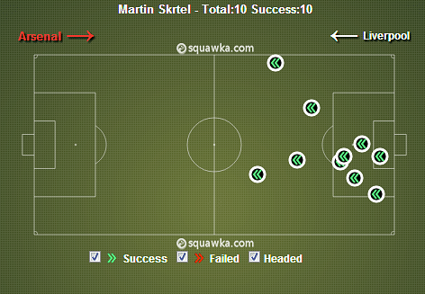 Sagna (46): A key player against Liverpool’s 3-5-2, Sagna was particularly impressive in the first half as Arsenal exploited their opponent’s narrow defensive shape. Sagna’s first half heat map below shows the extent to which he worked Aly Cissokho, including the cross for Sagna’s opening goal.