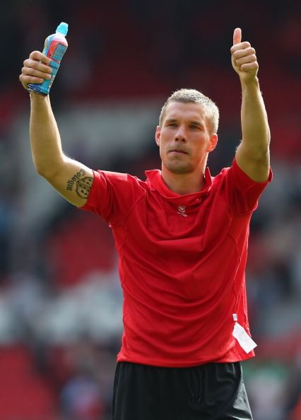 LIVERPOOL, ENGLAND – SEPTEMBER 02: Lukas Podolski of Arsenal celebrates after victory over Liverpool in the Barclays Premier League match between Liverpool and Arsenal at Anfield on September 2, 2012 in Liverpool, England.