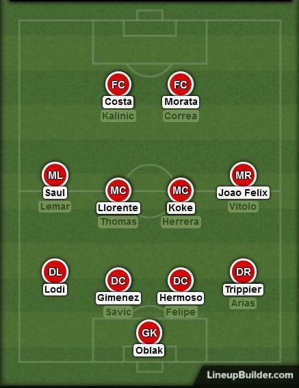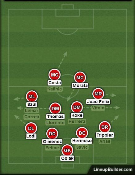 The midfield we're likely to see the most will be Saul and Felix on either side of Llorente and Koke centrally, with Morata and Costa combining upfront.
