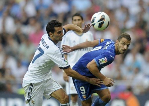 Real Madrid defender Alvaro Arbeloa (R) fights for the ball with Valencia’s forward Roberto Soldado (L) during a Spanish league football match at the Santiago Bernabeu stadium in Madrid. Real Madrid and Valencia drew 1-1.