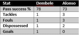It was not only in attack that the French winger beat the Spaniard. Dembele was also heavily involved in defending and put in a valiant tackle to deny Alonso a shot in the second half.