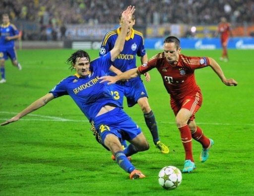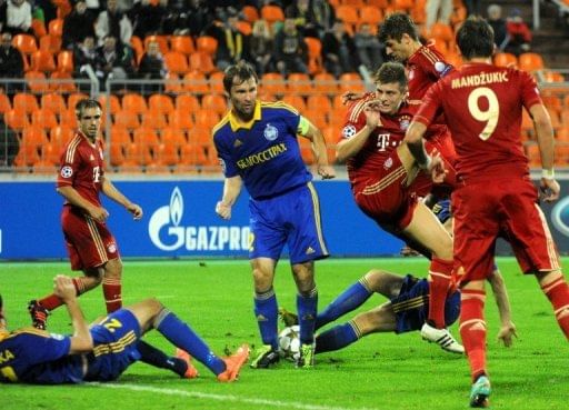 BATE Borisov’s captain Dzmitry Likhtarovich (C) fights for the ball against Bayern Munich’s Croatian striker Mario Mandzukic (R) during their Champions League Group F match in Minsk. The Belarus champions won 3-1 to go top of Group F.