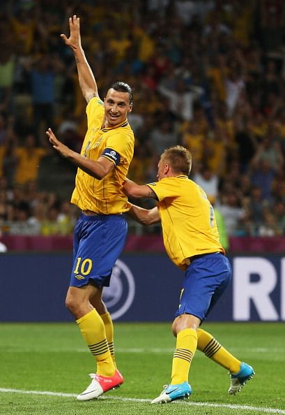 KIEV, UKRAINE – JUNE 19: Sebastian Larsson (R) of Sweden celebrates his goal with Zlatan Ibrahimovic during the UEFA EURO 2012 group D match between Sweden and France at The Olympic Stadium on June 19, 2012 in Kiev, Ukraine. (Photo by Julian Finney/Getty Images)