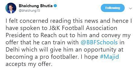 Meanwhile, Bhutia today tweeted that he has gotten in touch with the footballing authorities in J&K and have asked them to get in touch with Khan. Bhutia wishes that the estranged boy comes to Delhi and join his academy - the Bhaichung Bhutia Football School in Delhi in order to give him an opportunity of having a shot at pro football.