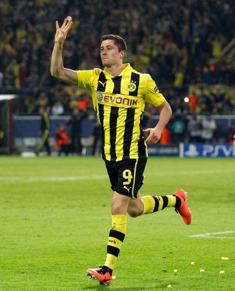 Robert Lewandowski celebrates after scoring a penalty to mark his team’s fourth goal during the UEFA Champions League semi final first leg match between Borussia Dortmund and Real Madrid at Signal Iduna Park on April 24, 2013