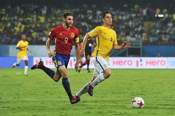 The first half started off showing signs that the European Champions would wipe the floor with their South American peers with that frantic high press and those cute little passing triangles that once had Sir Alex Ferguson saying of Barcelona - "They get you on that carousel and they make you dizzy with their passing" (there was a particularly brilliant moment when Diego Pampin, Sergio Gomez, Alvaro Garcia and Carlos Beita exchanged a series of passes that had the men in yellow chasing shadows and the partisan crowd on their feet - their eyes telling them to applaud despite their hearts telling them not to), but the fact that by the end of the first half, the possession stats read 64% Brazil to Spain's 36% is statistical proof that La Furia Roja did nothing of the sort.