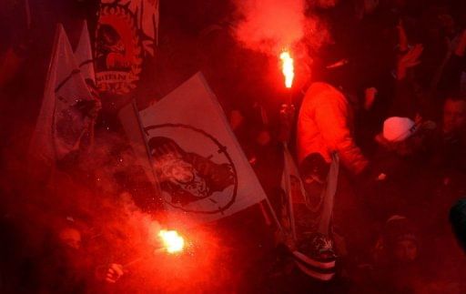 Hooligans hold flares during the German first division Bundesliga football match Bayer Leverkusen vs Eintracht Frankfurt in the German city of Leverkusen on January 19, 2013. Bayer enjoyed a 3-1 win at home to fourth-placed Eintracht Frankfurt, although the first-half was briefly held-up at the 15-minute mark after away fans lit flares in their block.