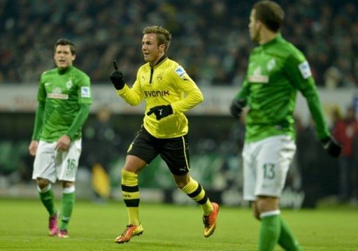 Dortmund’s Mario Goetze (C) celebrates scoring during their German first division Bundesliga football match against Werder Bremen at the Weser stadium in Bremen on January 19, 2013. Borussia Dortmund stayed in touch with the leaders with an emphatic 5-0 victory at Werder Bremen.