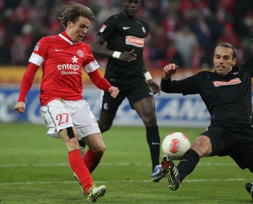 Mainz’ Nicolai Mueller (L) tries to score during their German first division Bundesliga football match against Freiburg in Mainz, southwestern Germany, on January 19, 2012. Mainz were held at home to a goalless draw by Freiburg.
