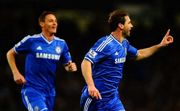 Branislav Ivanovic of Chelsea celebrates scoring their first goal against Manchester city at the Etihad