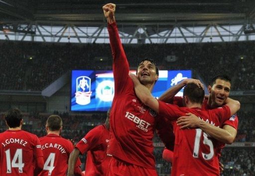 Wigan Athletic midfielder Paul Scharner (C) celebrates during their FA Cup match against Millwall on April 13, 2013. Wigan pulled away from trouble with seven wins from their final nine games last season after avoiding relegation on the final day of the season in 2011.