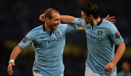 Manchester City’s Pablo Zabaleta (L) and Gareth Barry are pictured during a Premier League match in Manchester on January 1, 2013. “The FA Cup is a massive one. If we can win that, fantastic.,” Barry said.