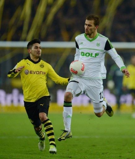 Wolfsburg’s striker Bas Dost (R) and Dortmund’s midfielder Ilkay Guendogan fight for the ball during their German first division Bundesliga football match in the German city of Dortmund. Wolfsburg won 3-2.