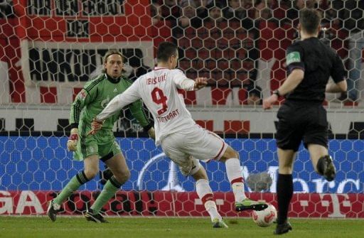 Stuttgart’s forward Vedad Ibisevic (C) scores his third goal past Schalke’s goalkeeper Timo Hildebrand (L) during their German first division Bundesliga football match in Stuttgart, southwestern Germany. Schalke 04‘s dropped further behind the leading trio with a 3-1 loss at VfB Stuttgart thanks to Ibisevic’s hat-trick.