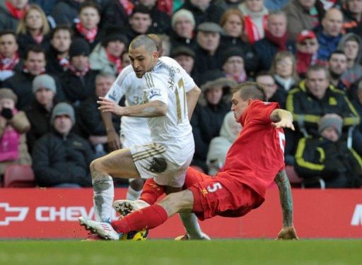 Liverpool’s Danish defender Daniel Agger (R) vies with Swansea City’s Israeli striker Itay Shechter (L) during the English Premier League football match between Liverpool and Swansea City at Anfield in Liverpool on February 17, 2013. Liverpool won the game 5-0.