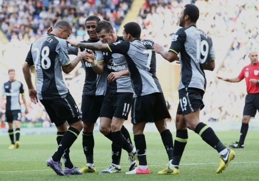 Tottenham Hotspurs’ Gareth Bale (C) celebrates with teammates after scoring Tottenham’s second goal during the English Premier League football match between Reading and Tottenham Hotspurs at The Madejski Stadium, in Reading. Tottenham Hotspur enjoyed their first victory under Andre Villas-Boas courtesy of a 3-1 Premier League win away to Reading.