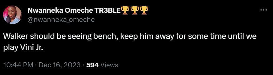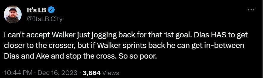 "Walker on the pitch for 90mins doing absolutely nothing. most of the goals coming from his side this season. shocking from our captain."