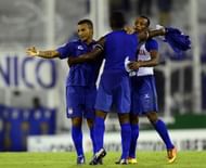 Ecuador’s Emelec players celebrate at the end of their Copa Libertadores 2013 Group 4 football match against Argentina’s Velez Sarsfield at Jose Amalfitani stadium in Buenos Aires, Argentina, on April 9, 2013.