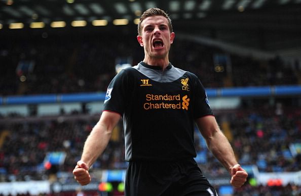 BIRMINGHAM, ENGLAND – MARCH 31: Liverpool Jordan Henderson celebrates after scoring the first Liverpool goal during the Barclays Premier League match between Aston Villa and Liverpool at Villa Park