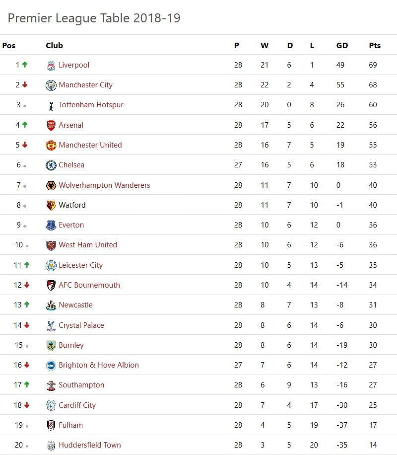 The biggest result came for Chelsea as they comprehensively beat North London rivals Tottenham to close in on the gap between either team. A Pedro strike and a Trippier own goal were enough for the blues to see off their counterparts in a match where head coach Maurizio Sarri dropped his first-team keeper, Kepa Arrizabalaga after the player's refusal to come off in Chelsea's league cup final loss over the weekend.