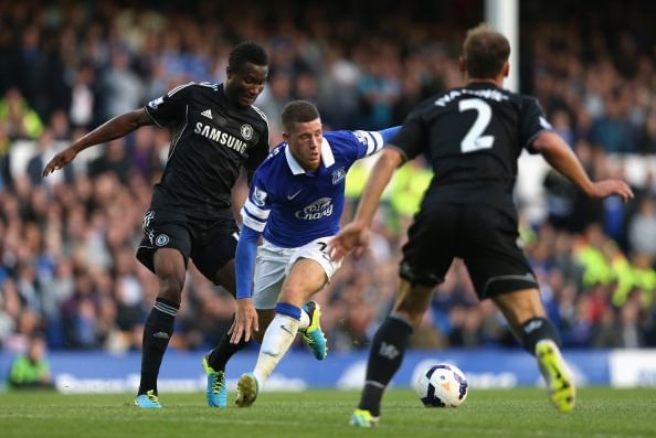 Ross Barkley of Everton competes with John Obi Mikel of Chelsea during the Barclays Premier League match between Everton and Chelsea at Goodison Park on September 14, 2013 in Liverpool, England. (Photo by Clive Brunskill/Getty Images)