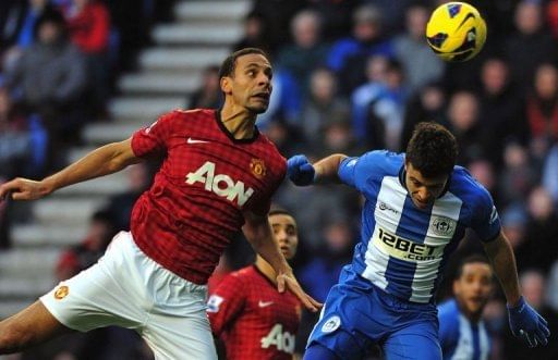 Manchester United’s English defender Rio Ferdinand (L) vies with Wigan Athletic’s Argentinian striker Franco Di Santo (R) during the English Premier League football match between Wigan Athletic and Manchester United at The DW Stadium in Wigan, north-west England on January 1, 2013. United won 4-0.