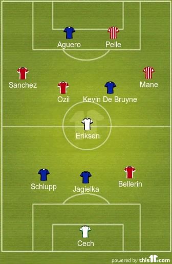 Arsenal fans celebrating their team’s victory over rivals Man UnitedIt was another exciting weekend in the Premier League that saw a lot of changes in the league table. Gameweek 8 kickstarted on Saturday at Selhurst Park which hosted the match between high-flying Crystal Palace and West Brom. The home team picked up yet another impressive 2-0 victory over the Baggies courtesy of Yannick Bolasie and Yohan Cabaye’s goal.It was then followed up by Sergio Aguero’s 5-goal thriller which stunned the attendants at the Etihad Stadium. With the victory over Newcastle United, Manchester City reclaimed their spot at the top of the league, who are now two points ahead of Arsenal.Super Sunday saw two of the anticipating derby clashes, including one at Merseyside. Everton, who have been impressive right from the start of the season hosted Liverpool at Goodison Park. Like any other derby match, the one in Merseyside was filled with intensity and controversies over the course of the match. However, the match ended in a 1-1 draw with both teams happy to share a point each.Another derby was held in London between Arsenal and Manchester United. The rivalry between the two clubs was intense back in the early 2000s, who battle against each other on all fronts. The home team asserted their authority when Alex Sanchez scored the opener which was assisted by none other than Mesut Ozil. 74 seconds later, Ozil doubled the lead for the Gunners and they were already in a commanding position.It was then followed up Sanchez’s screamer which ended at the top corner of David De Gea’s net. The Red Devils were outgunned as they had never conceded three goals in quick successions. The scoreline was recorded as the fastest 3-0 victory against United in Premier League history since 1995.To top off a good, action packed weekend in the Premier League Christian Eriksen saved Spurs’ blushes by netting two wonderful free kicks.So who makes it to the team of the week this time around? We’ve used a 3-5-2 formation this week.