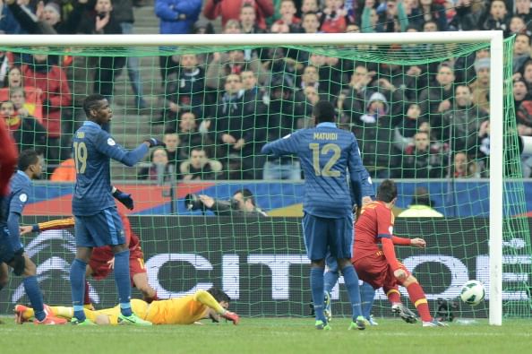 France’s goalkeeper Hugo Lloris (C) looks at the ball rolling in his net during the World Cup 2014 qualifying football match France vs Spain on March 26, 2013 at the Stade de France