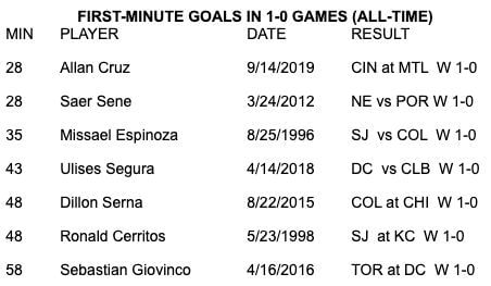 - FC Cincinnati put an end to a four-game losing run, winning for the first time since July 13, defeating the Montréal Impact by the game’s only goal at Stade Saputo on Saturday evening. Allan Cruz netted the lone goal after just 28 seconds – it equaled the longest a team made a 1-0 lead stand up for a win in MLS history.