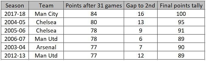 Let it sink in; those above mentioned teams have had gaps of 16, 13, 12, 9, 7 and 6 points at this stage, with just 7 games remaining. That would mean that to topple those teams, the chasing teams would have had to hope that those teams lose at least 3 games, whilst ensuring they themselves win all their remaining matches, which is just absurd. Point is that, all these winners had wrapped up their leagues by this point. And this Liverpool side would probably go a point behind City after they play their game in hand.
