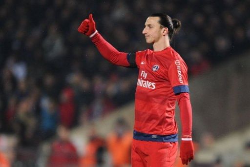 Paris’ forward Zlatan Ibrahimovic reacts during the French L1 football match Bordeaux (FCGB) vs Paris Saint-Germain (PSG), on January 20, 2013 at Chaban Delmas Stadium in Bordeaux. PSG won 1-0.