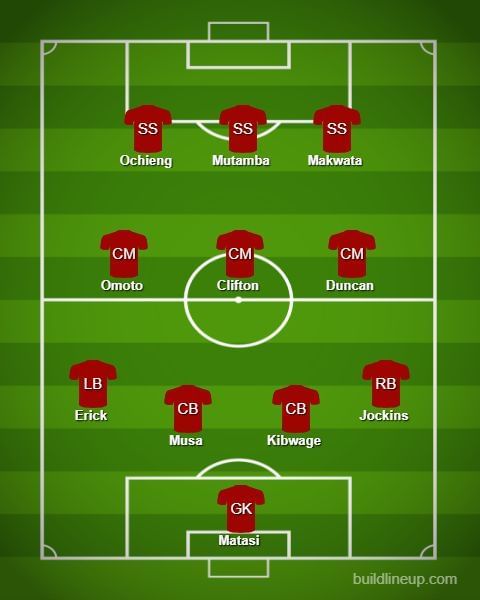 Kenya Probable XI: Patrick Matasi (GK) ; Jockins, Kibwage, Musa, Erick ; Omoto, Clifton, Duncan ; Makwata, Ochieng, Mutamba