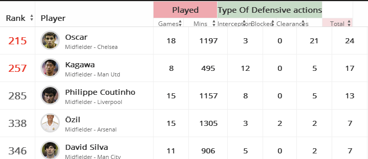 Compared to his opposite numbers at Chelsea, City, Liverpool and Arsenal, Kagawa comes out second for his defensive actions, and top for interceptions. Meanwhile, his performances as a duellist appear to have been hampered by a lack of minutes rather than application, that is until you look at these numbers in the context of his own team-mates.