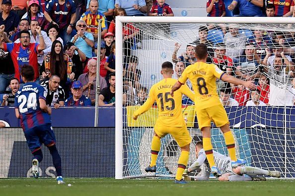 Conceding three goals in seven minutes is dreadful for any top team's defence. The Catalans have had their worst start to a season defensively, allowing 14 goals in just eleven matches. Today, the first two goals were defensive errors from Gerard Pique. The first one was a weak clearance from the Spaniard as Levante scored just after getting back possession. The second one was even worse as he was slow to pick up the turn of Borja Mayoral who scored from range.