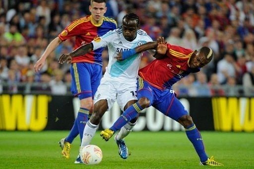 Chelsea’s midfielder Victor Moses (C) clashes with Basel’s midfielder Geoffroy Serey Die (R) during their UEFA Europa League first leg semi-final football match at the St Jakob stadium in Basel on April 25, 2013. Chelsea won 2-1.