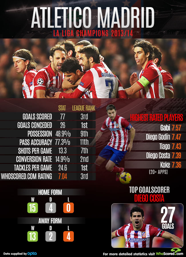 Koke and Diego Costa did provide the entertainment for anyone watching Atleti though, and the relationship on the field between the pair was brilliant to watch unfold. Koke ended the season with 13 assists, second overall only to Ángel Di María’s total of 17, and the Spanish youngster also bagged six goals. His transition from a soothing, deep-lying midfielder to all-action interior midfielder is one of Simeone’s finest actions. Diego Costa, meanwhile, ditched the histrionics for the most part and focused on becoming one of the most feared strikers around, harnessing his aggression in positive fashion. The striker finished up with 27 goals, 35% of Atleti’s final total to be exact. Questions remain about how sustainable this Atleti success is, but for now they can enjoy their moment as champions. As far as the chasing pack goes Barcelona did well just to be there at the bitter end. It was a mediocre season by their standards as they came away empty handed on all fronts, and with Luis Enrique at the helm they will hope to recapture the values which made them great. Dani Alves, with a 7.4 rating, and Lionel Messi, with 8.42, were Barcelona’s sole representatives in WhoScored’s Team of the Season. Enrique will need to assert his authority defensively when he arrives, as Barca have been shaken all too often. 27% of their goals conceded this season (9 of 33) came courtesy of opponents’ corner kicks. The problems at Barca are all too evident and have been for some time, they must be addressed before they slip further off the pace of Europe’s elite.Real Madrid meanwhile ran out of gas in the final stretch, lacking the motivation and desire to assault the title on the final day. Cristiano Ronaldo was as immense as ever, tallying 31 goals, while Gareth Bale managed 15 in his debut season. Those at the Bernabéu may argue a bigger prize was always in mind though, as they are set to thrash it out with Atleti for the Champions League. Di María did have an extraordinary season though, facilitating for the loss of Mesut Ozil, which caused concern for many.Elsewhere Athletic Bilbao returned from a dismal season under Marcelo Bielsa to come back in scintillating fashion with the often-underrated Ernesto Valverde. The football, when at its best, was fluid and incisive. Ander Herrera recaptured his best form and was the highest rated player overall with 7.38, but Ander Iturraspe’s call-up to the Spanish squad highlighted the notion that he was the backbone of Athletic over the course of the season. Aymeric Laporte emerged out of defence too, and if Athletic manage to keep him, amongst others, they could improve on their 4th place finish next season.Villarreal impressed too, finishing sixth after their year in Segunda, and became the highest ranking newly promoted side since Celta Vigo in 2005/2006. In fact, all three promoted sides ended up retaining their top-flight status, something done recently in only 00/01 and 11/12. Real Betis were one of those that did go down, suffering a staggering decline from their 7th place finish last season to finish bottom with just six wins all season. The club brought in too many players, going with quantity over quality, and in the process lost the unity that made them so good in the first place. Osasuna too, after 14 consecutive seasons – the sixth longest run in La Liga - were condemned to Segunda.Valencia were Valencia, never really finding consistency and when they did it would inevitably come crashing down. Sevilla were buoyed by the pairing of Carlos Bacca and Kevin Gameiro who managed 29 goals in the league between them, and narrowly missed out on Champions League football. They did claim a Europa League prize, however. Real Sociedad, as expected, couldn’t repeat the efforts of last season, dropping to 7th despite only attaining seven fewer points.