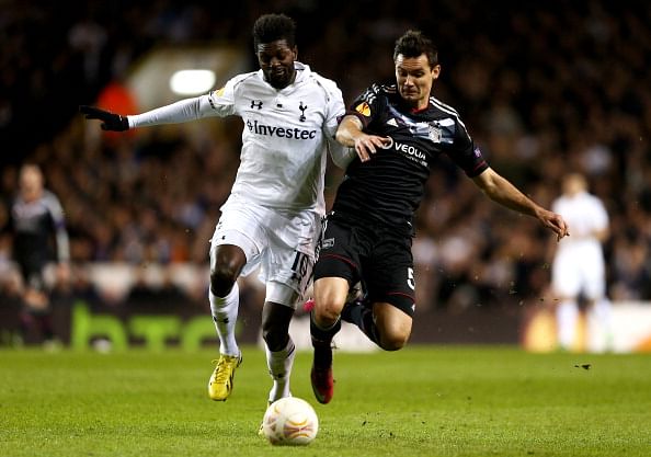 LONDON, ENGLAND – FEBRUARY 14: Dejan Lovren challenging Emmanuel Adebayour during the UEFA Europa League round of 32 first leg match between Tottenham Hotspur and Olympique Lyonnais at White Hart Lane on February 14, 2013 in London, England.