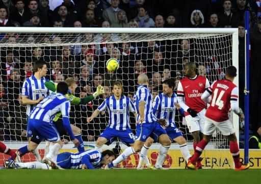 Arsenal‘s Theo Walcott (R) scores their third goal during their 3-2 FA Cup fourth round win over Brighton & Hove Albion at The American Express Community Stadium in Brighton, on January 26, 2013.