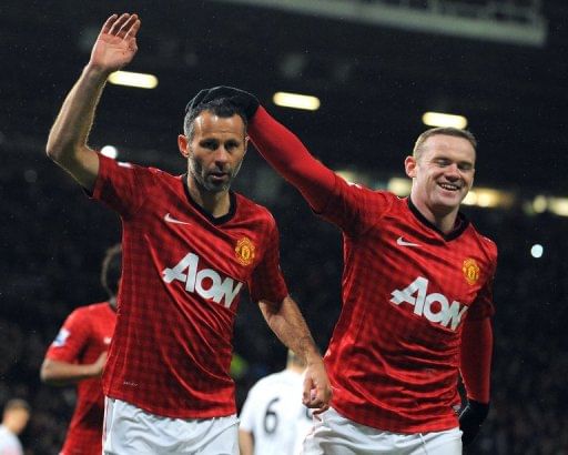 Manchester United‘s Ryan Giggs (L) celebrates with Wayne Rooney after scoring a penalty during their 4-1 FA Cup football win over Fulham at Old Trafford on January 26, 2013.