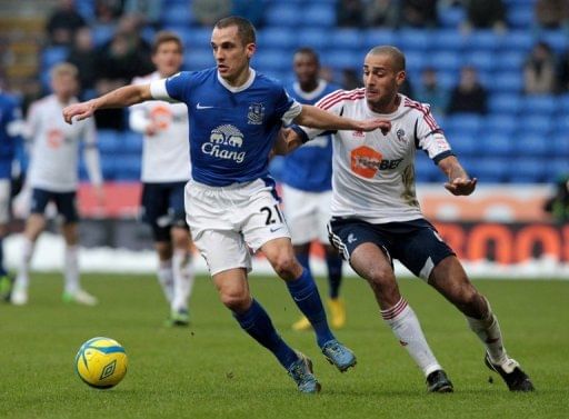 Bolton Wandererers’ Darren Pratley (R) takes on Everton‘s Leon Osman during their FA Cup fourth round match at the Reebok Stadium in Bolton on January 26, 2013. Everton won 2-1