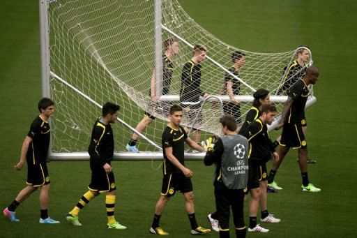 Borussia Dortmund’s players take part in a training session at the Rosaleda stadium in Malaga on April 2, 2013, on the eve of the UEFA Champions league football match Malaga vs Borussia Dortmund.